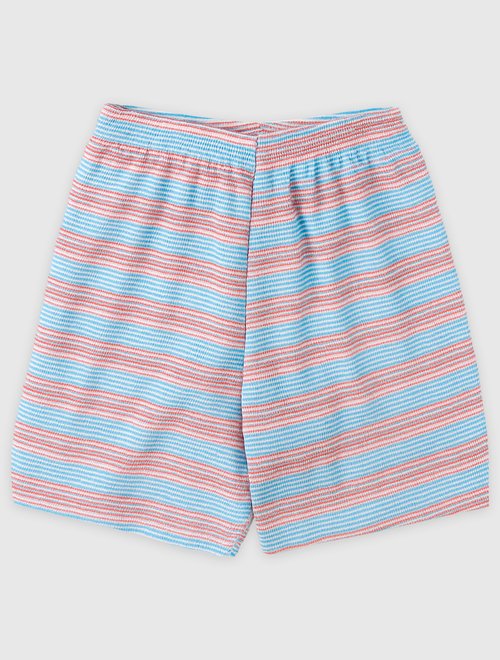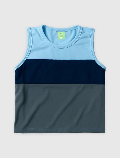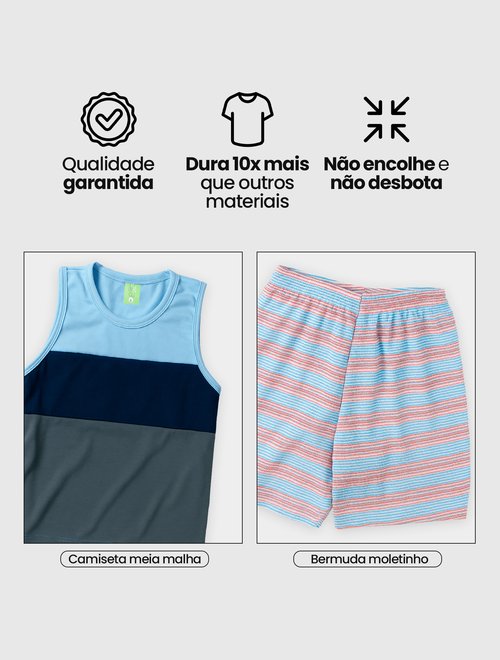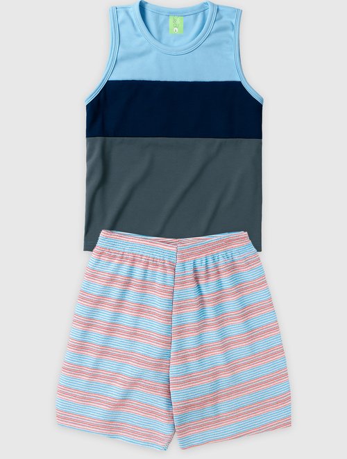 Conforto e estilo que acompanham os meninos em todas as aventuras! Esse conjunto é composto por uma regata com recorte moderno em azul marinho e azul claro, combinada com uma bermuda listrada cheia de personalidade. Um visual leve, colorido e perfeito para os dias quentes!